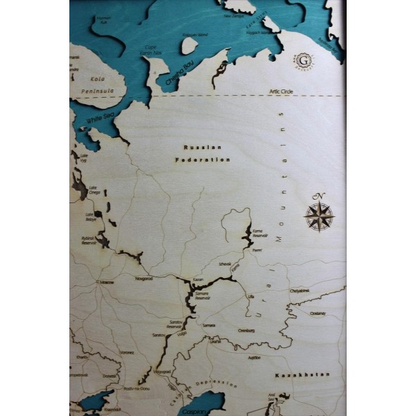 Le mappe si compongono in strati di legno di betulla, tagliati e incisi al laser, per conferire profondità visiva all'opera.