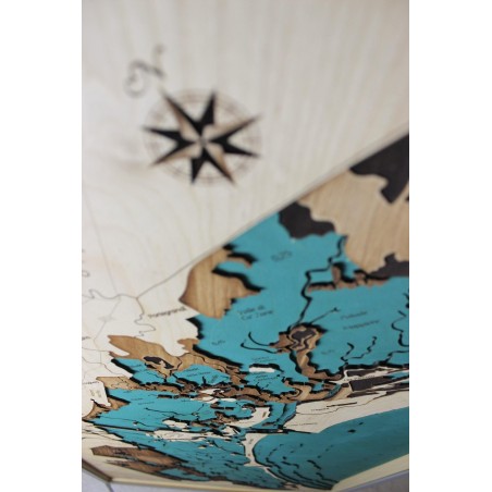 Le mappe si compongono in strati di legno di betulla, tagliati e incisi al laser, per conferire profondità visiva all'opera.