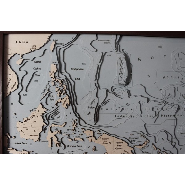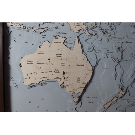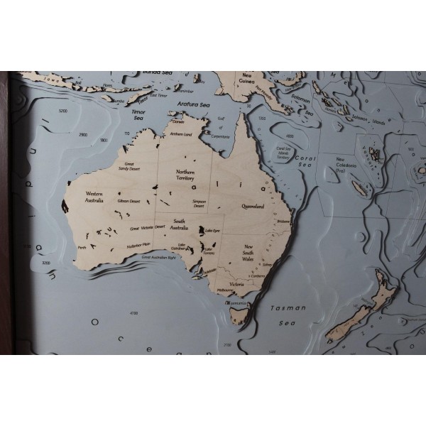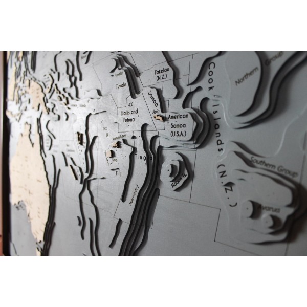 Le mappe si compongono in strati di legno di betulla, tagliati e incisi al laser, per conferire profondità visiva all'opera.