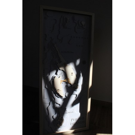 Le mappe si compongono in strati di legno di betulla, tagliati e incisi al laser, per conferire profondità visiva all'opera.